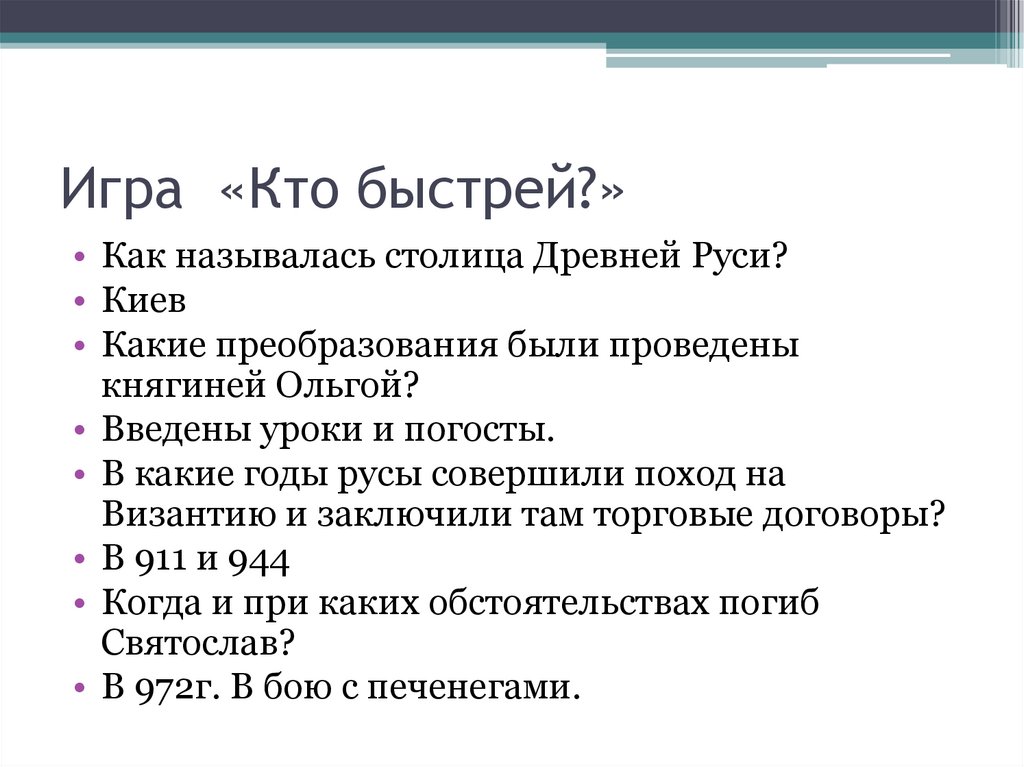 Игра «Кто быстрей?»• Как называлась столица Древней Руси?