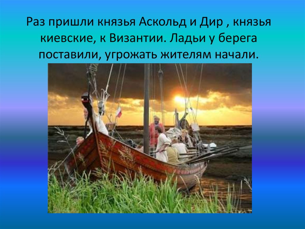 Раз пришли князья Аскольд и Дир , князьякиевские, к Византии. Ладьи у берега