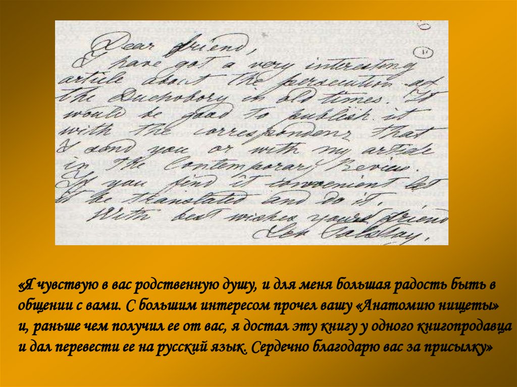 «Я чувствую в вас родственную душу, и для меня большая радость быть вобщении с вами. С большим интересом прочел вашу «Анатомию нищеты»