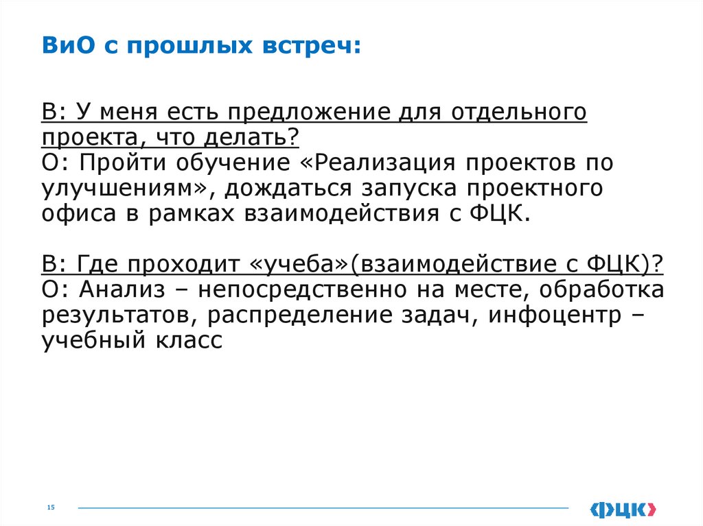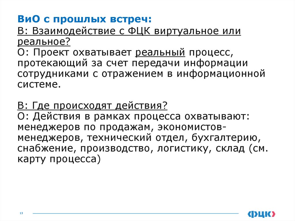 ВиО с прошлых встреч:В: Взаимодействие с ФЦК виртуальное или