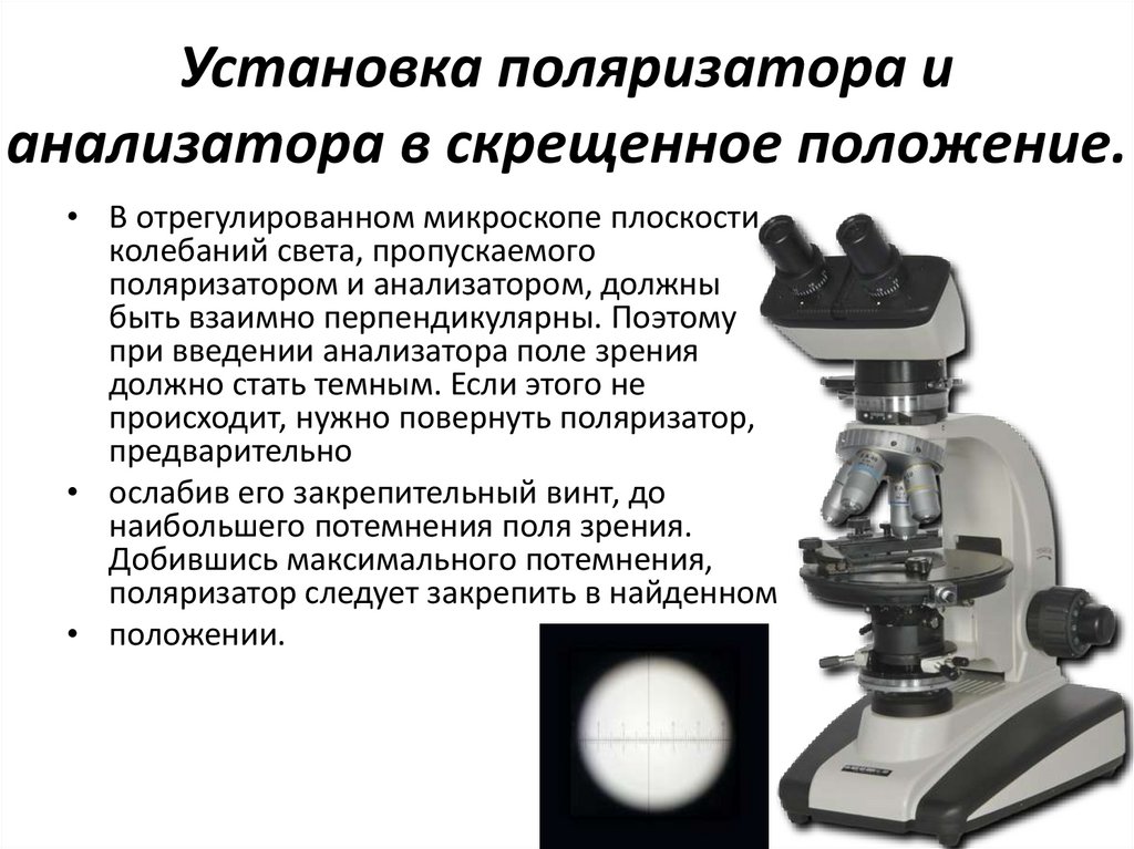 которой будет отражать направление плоскости поляризации нижнего николя. Обычно оно совпадает с горизонтальной нитью окуляра.