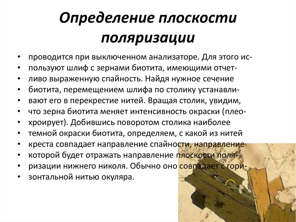 проводится при выключенном анализаторе. Для этого используют шлиф с зернами биотита, имеющими отчетливо выраженную спайность. Найдя нужное сечение
