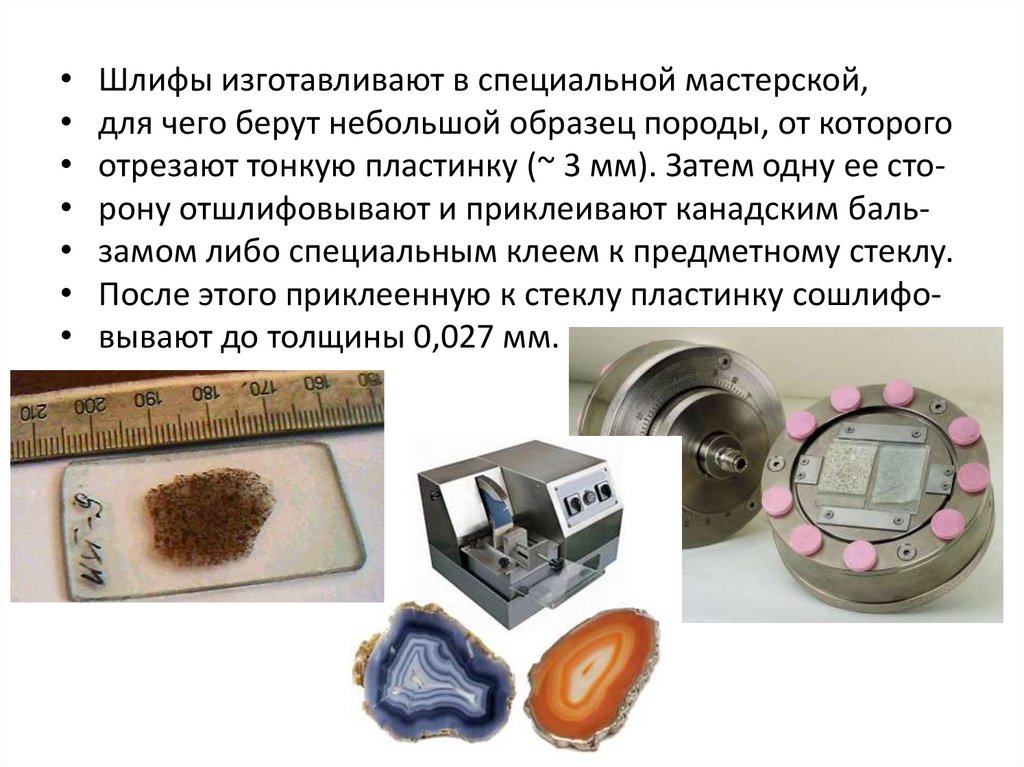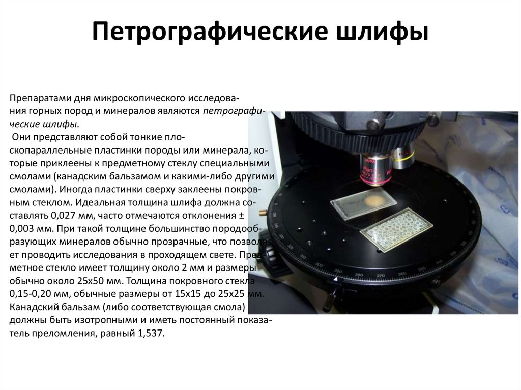 Они представляют собой тонкие плоскопараллельные пластинки породы или минерала, которые приклеены к предметному стеклу специальными