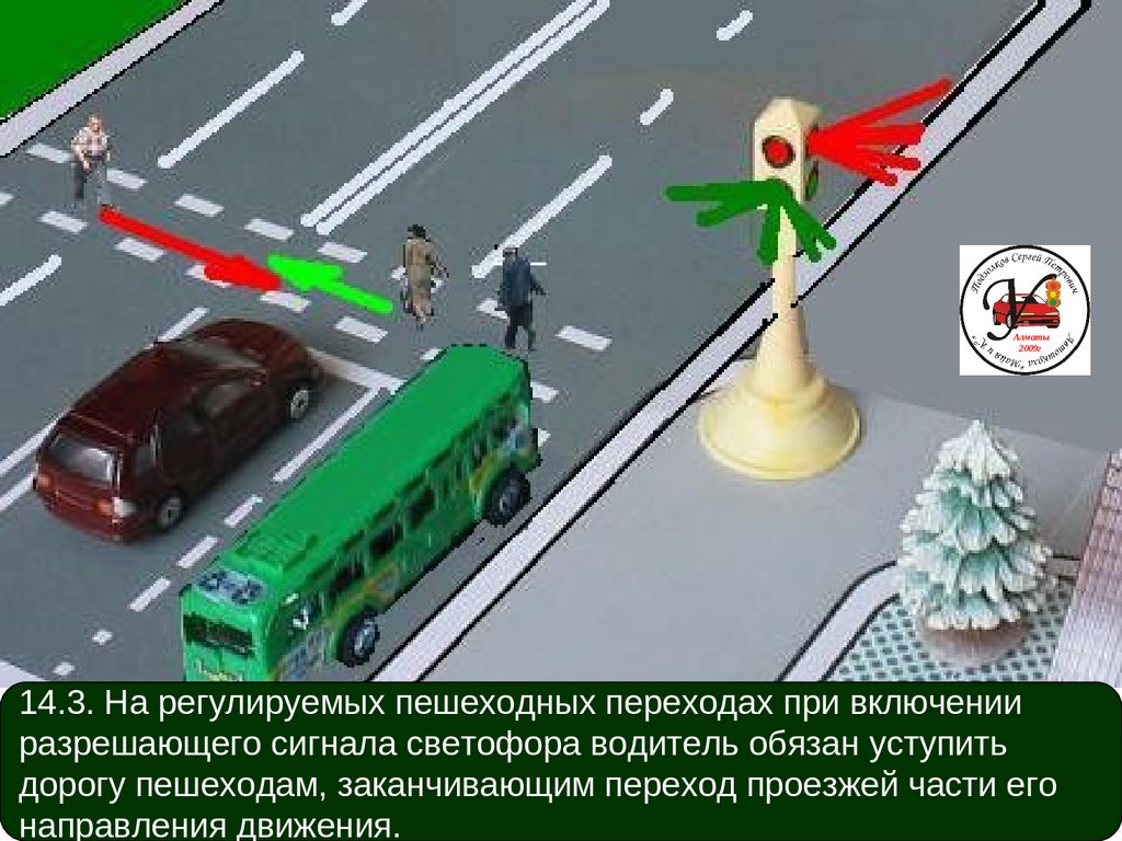 14.3. На регулируемых пешеходных переходах при включении