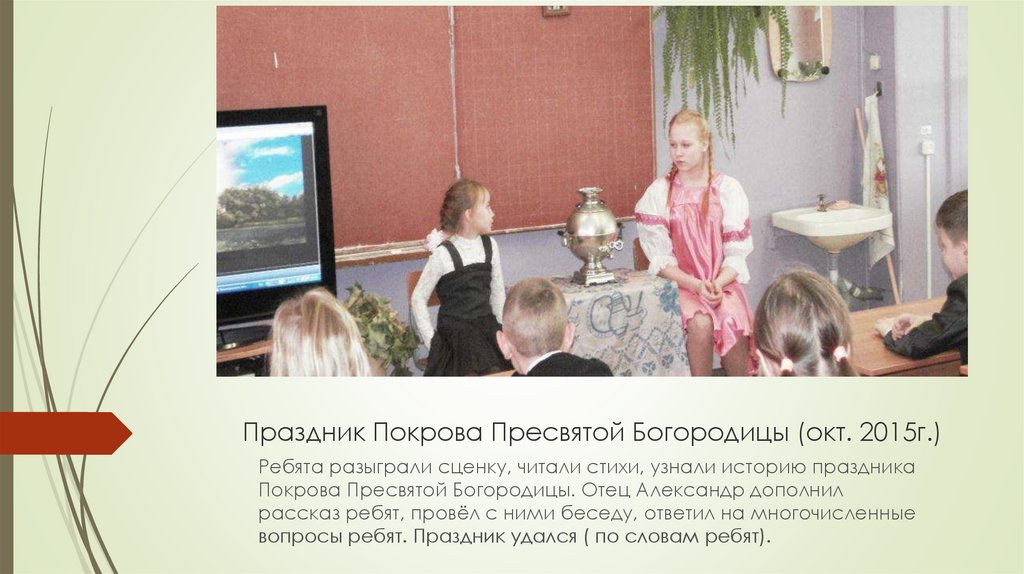 Праздник Покрова Пресвятой Богородицы (окт. 2015г.)Ребята разыграли сценку, читали стихи, узнали историю праздника