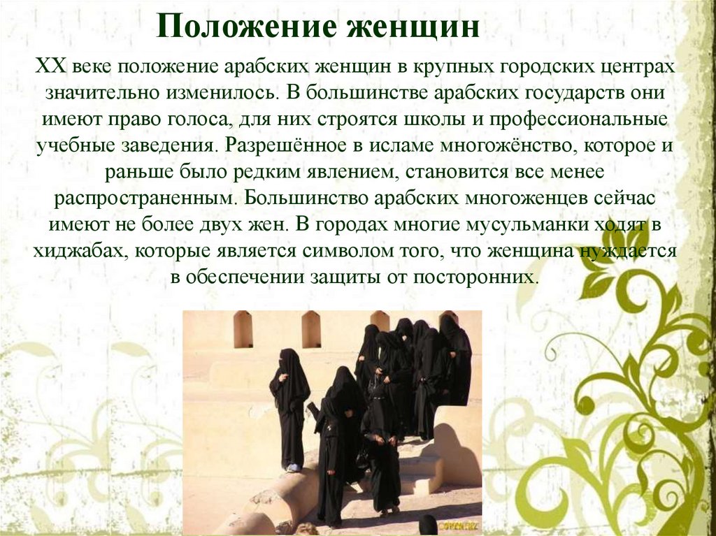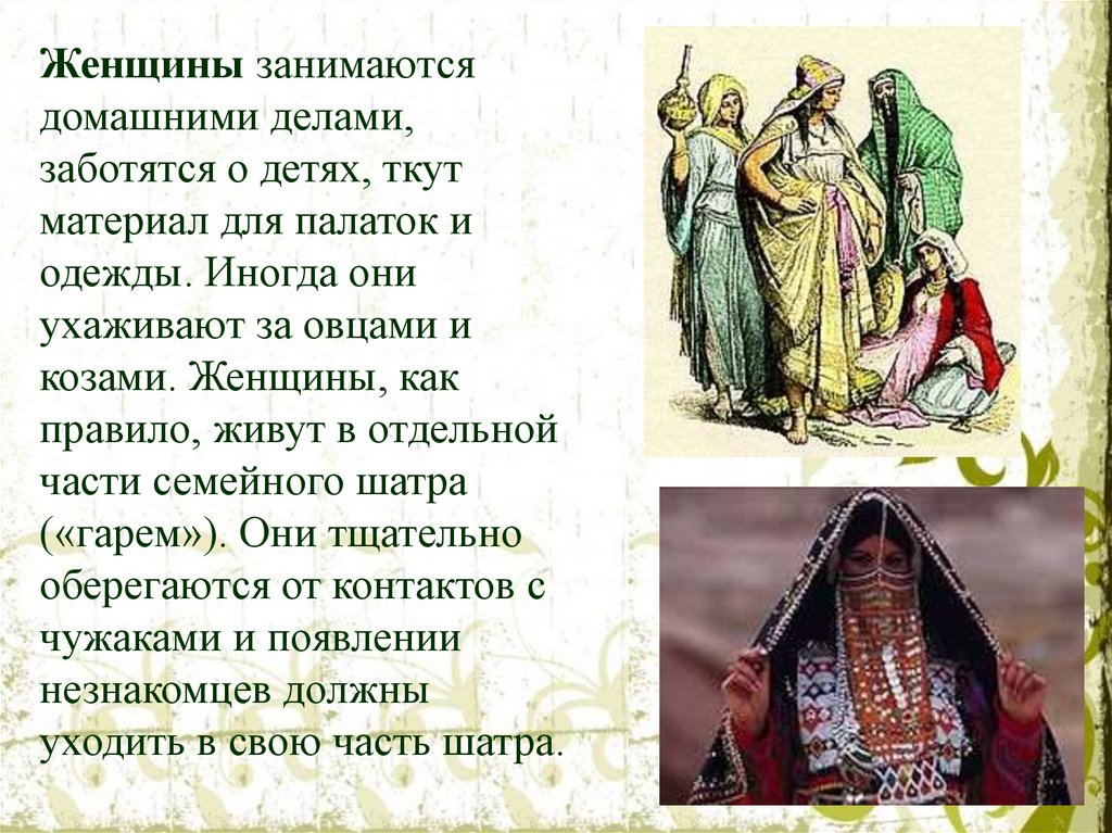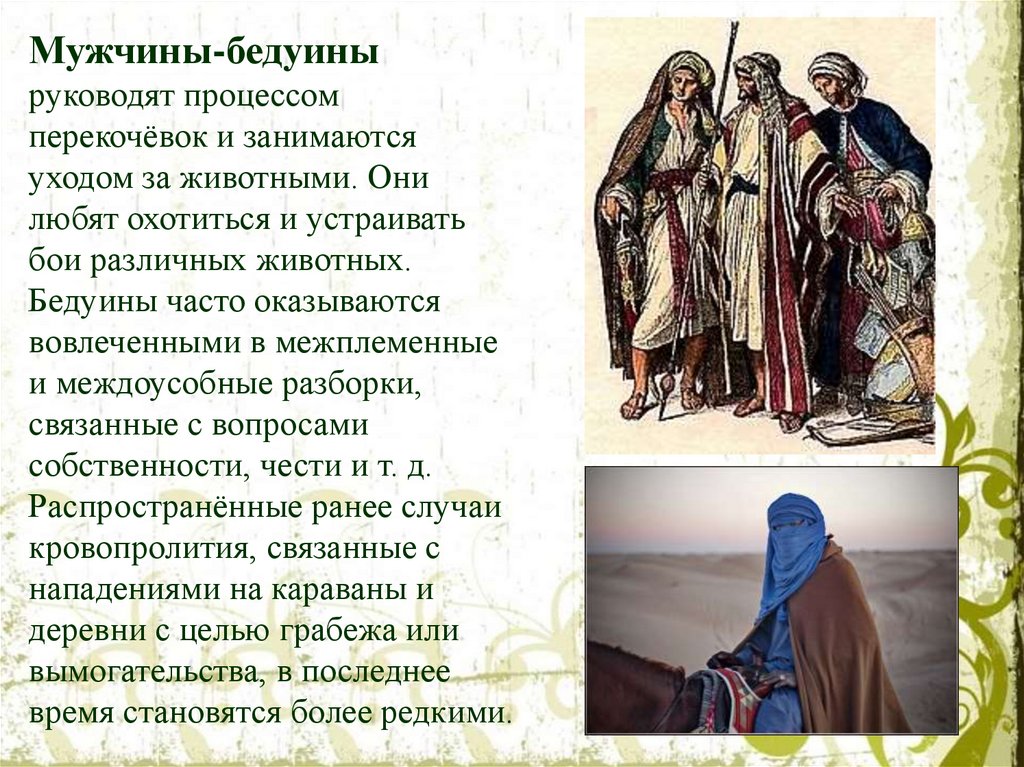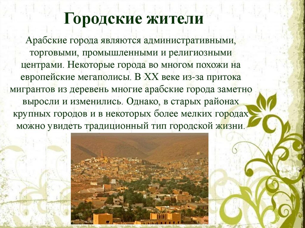 Арабы подразделяются на три основныегруппы: бедуины-скотоводы, крестьянеземледельцы и городские жители.