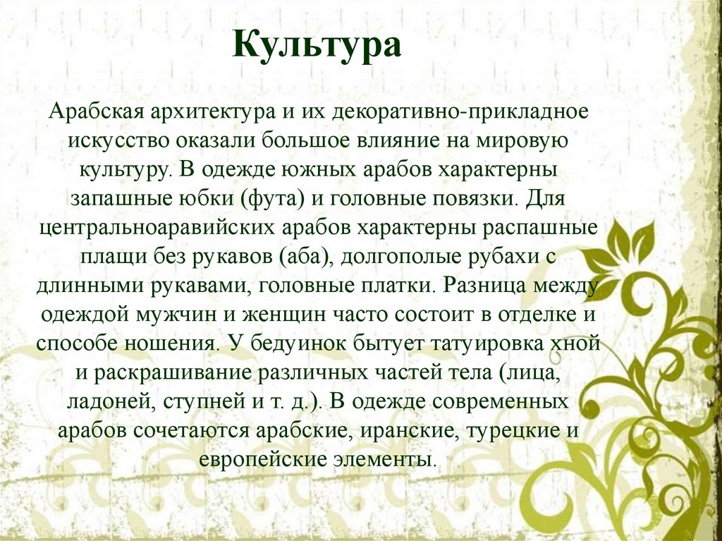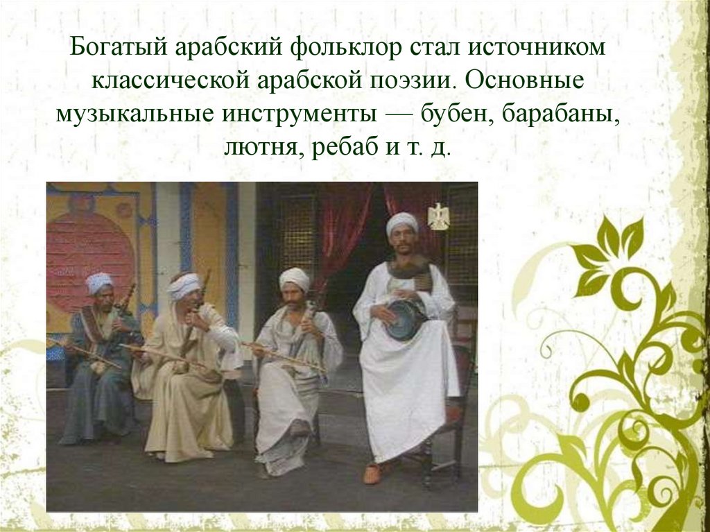 Богатый арабский фольклор стал источникомклассической арабской поэзии. Основные