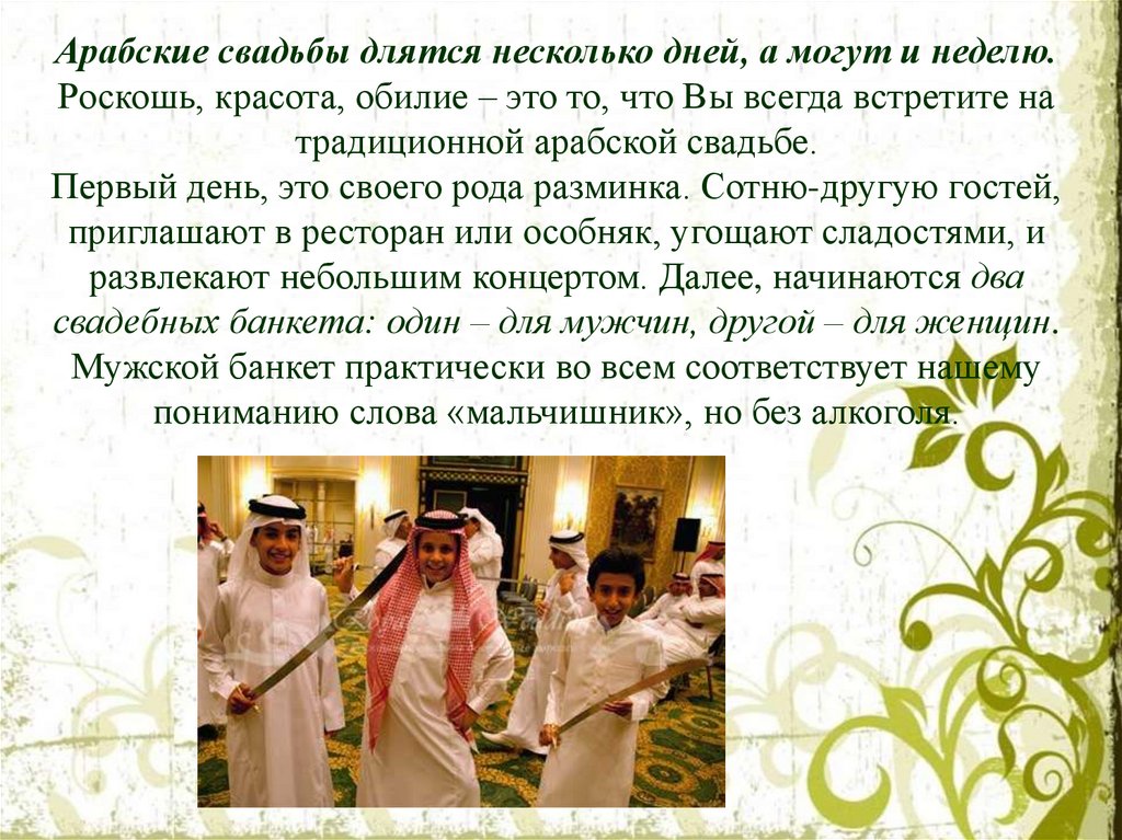 Арабские свадьбы длятся несколько дней, а могут и неделю.Роскошь, красота, обилие – это то, что Вы всегда встретите на
