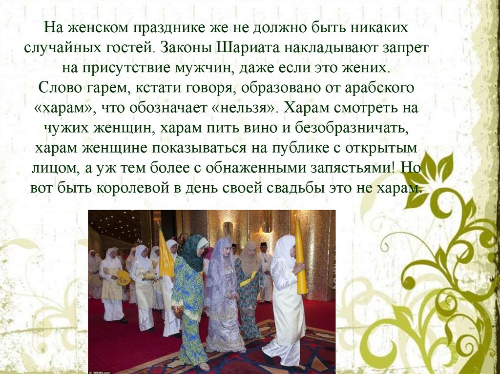 На женском празднике же не должно быть никакихслучайных гостей. Законы Шариата накладывают запрет