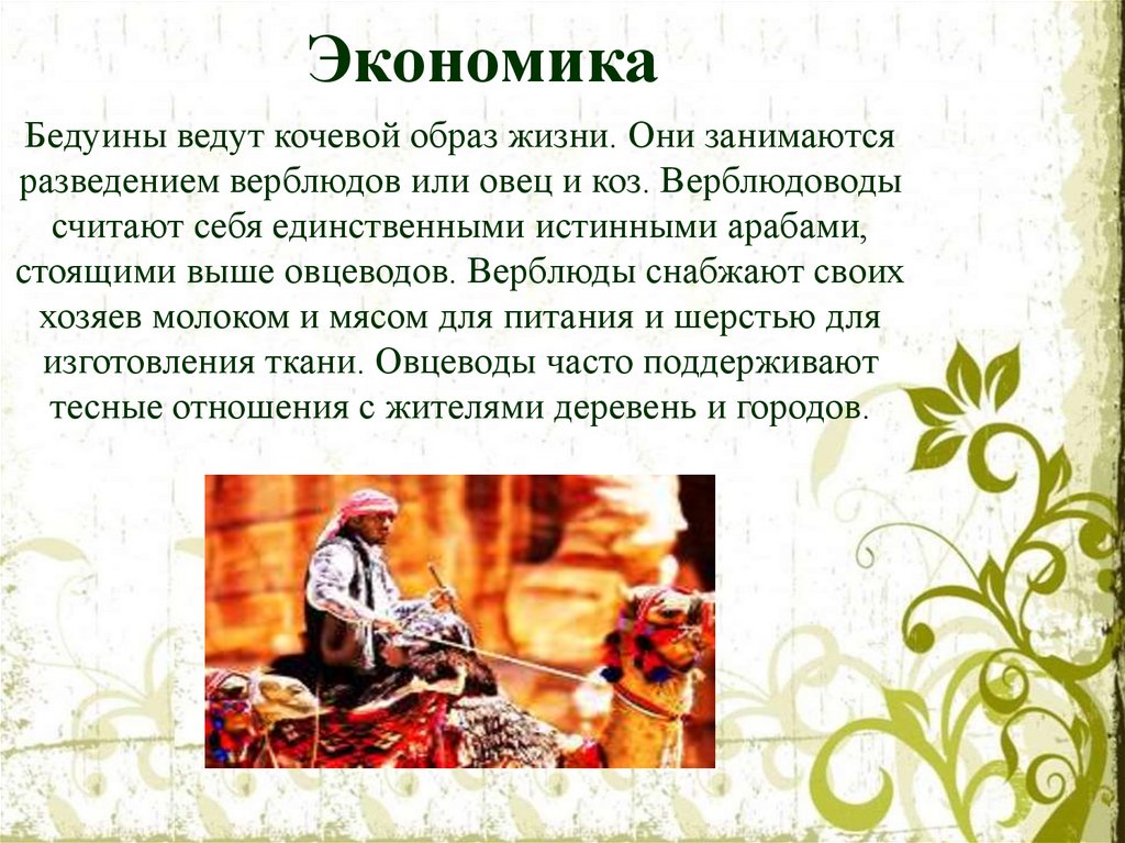ЭкономикаБедуины ведут кочевой образ жизни. Они занимаются