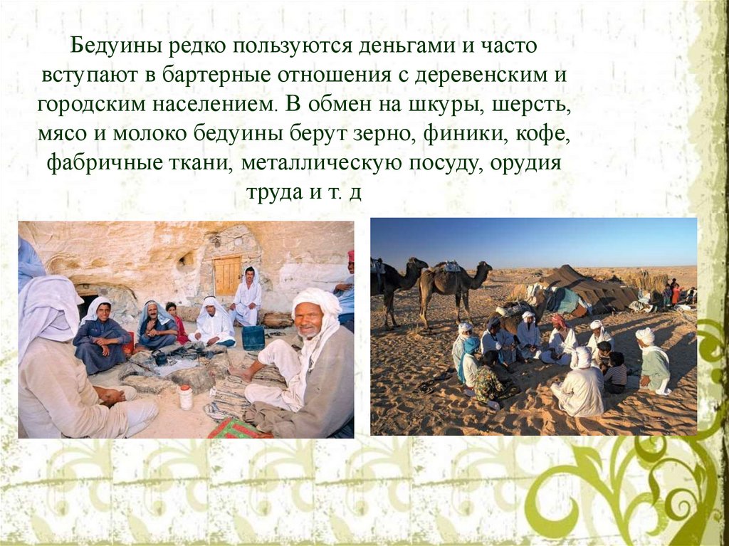 Бедуины редко пользуются деньгами и частовступают в бартерные отношения с деревенским и