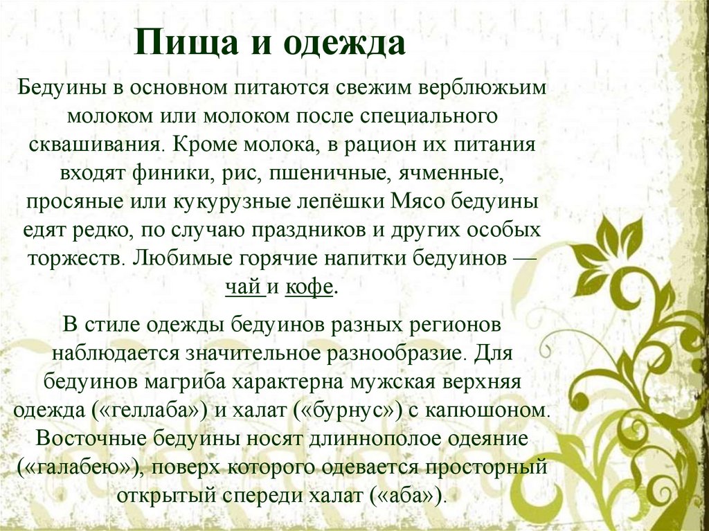 Пища и одеждаБедуины в основном питаются свежим верблюжьим