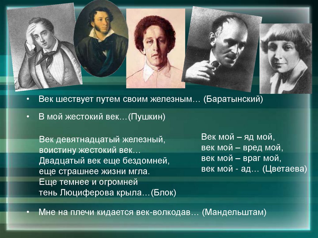 • Век шествует путем своим железным… (Баратынский)• В мой жестокий век…(Пушкин)