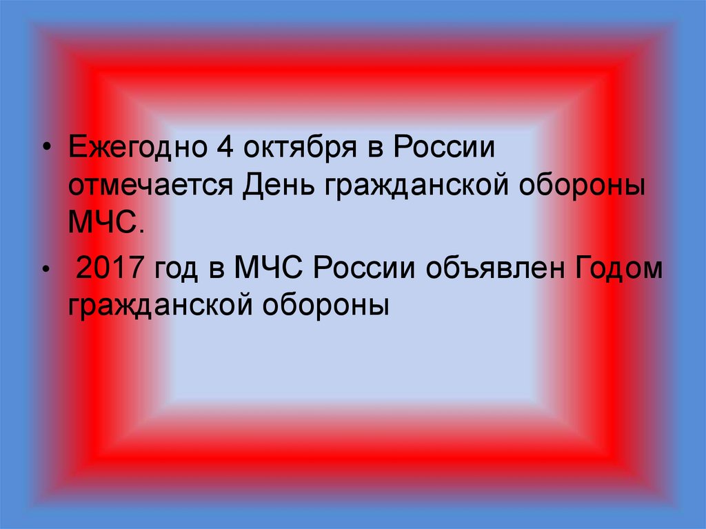 • Ежегодно 4 октября в Россииотмечается День гражданской обороны