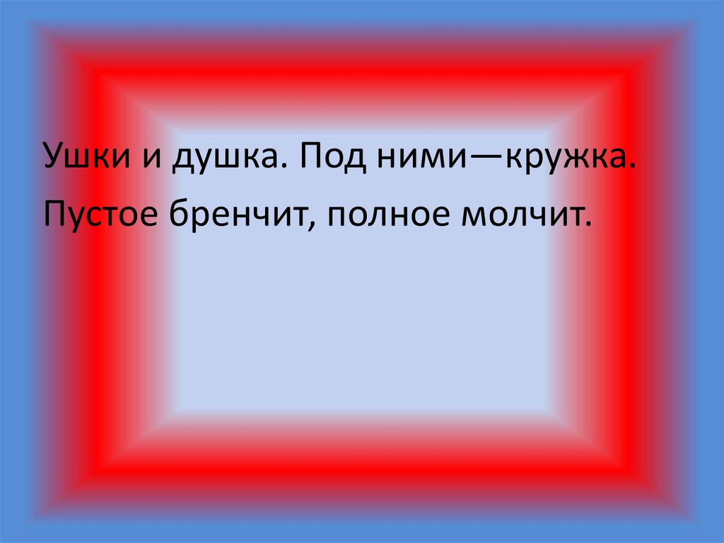 Ушки и душка. Под ними—кружка.Пустое бренчит, полное молчит.