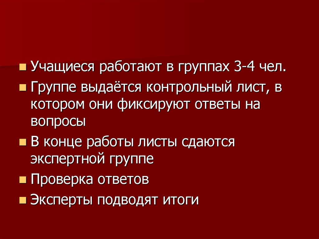Учащиеся работают в группах 3-4 чел.Группе выдаётся контрольный лист, в