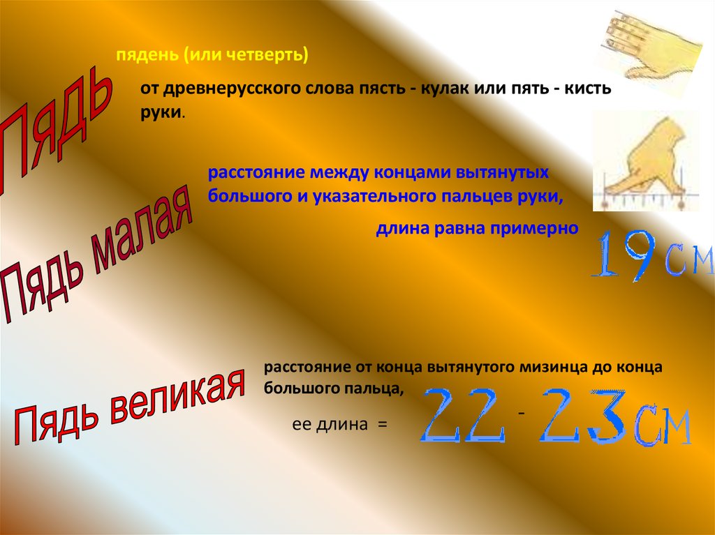 пядень (или четверть)от древнерусского слова пясть - кулак или пять - кисть