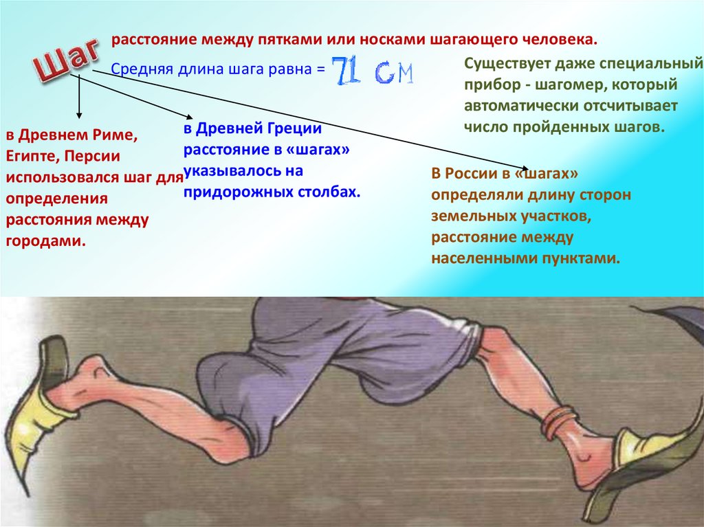 расстояние между пятками или носками шагающего человека.Существует даже специальный