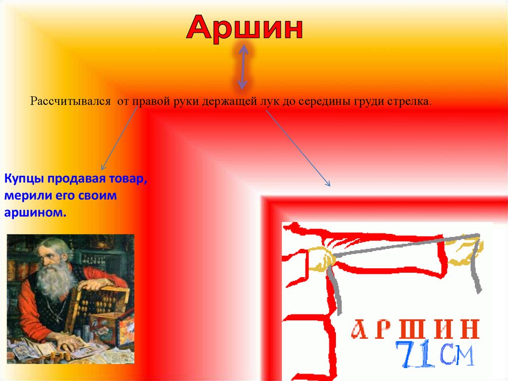 Рассчитывался от правой руки держащей лук до середины груди стрелка.Купцы продавая товар,