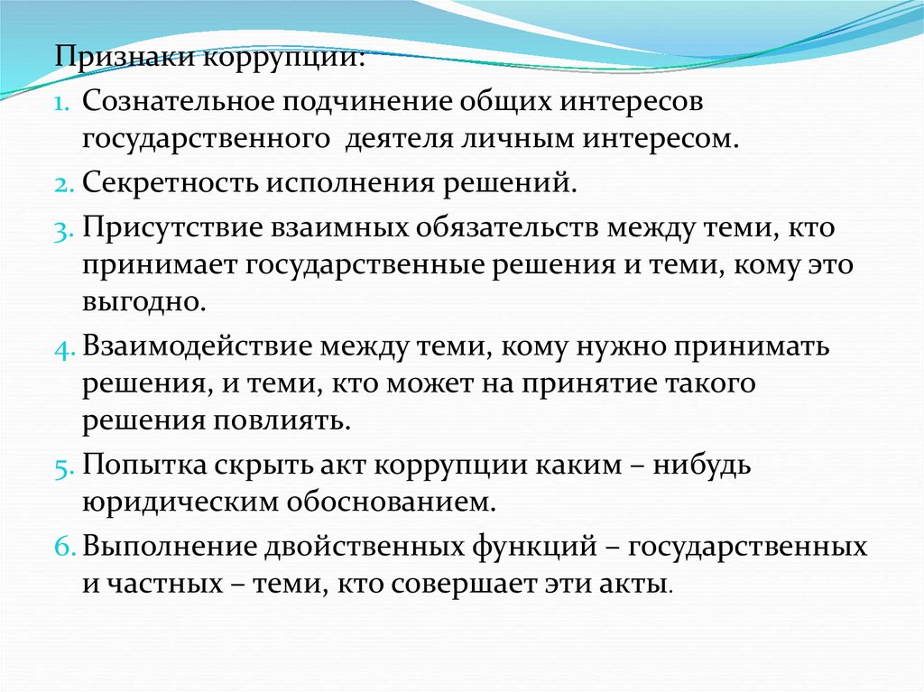 Признаки коррупции:1. Сознательное подчинение общих интересов