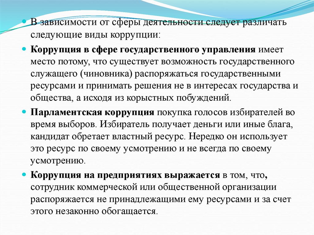 В зависимости от сферы деятельности следует различатьследующие виды коррупции: