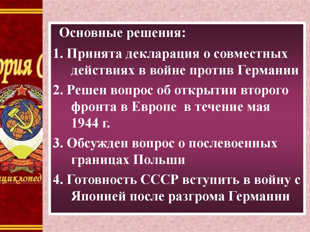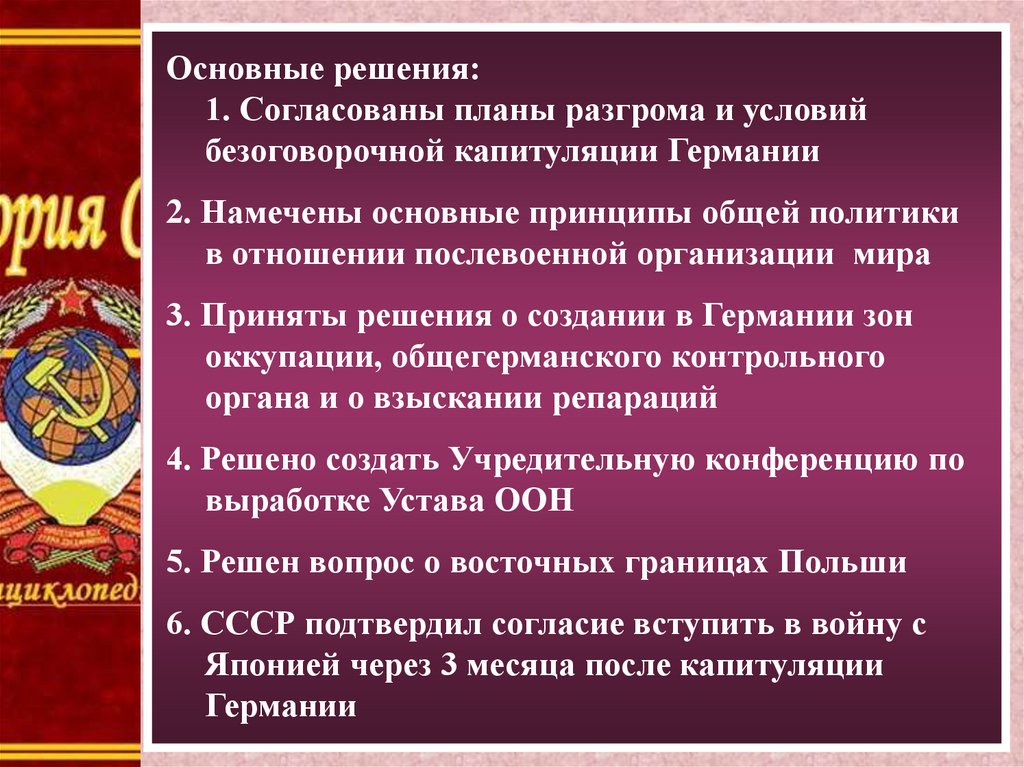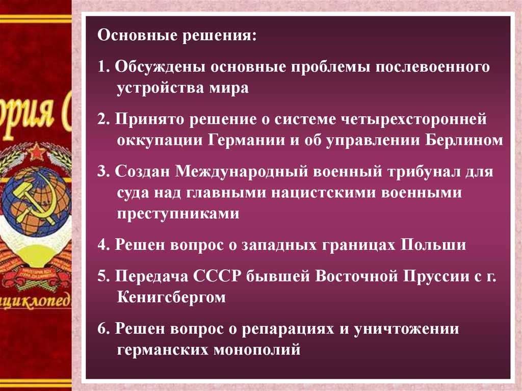 Основные решения:1. Обсуждены основные проблемы послевоенного