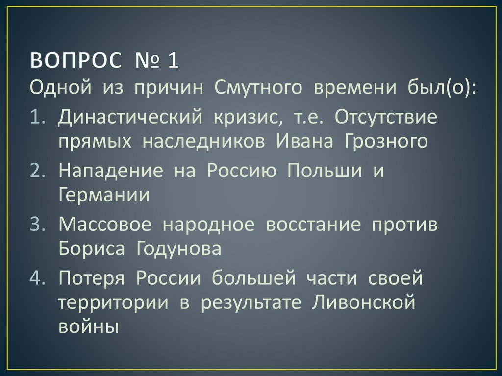 Одной из причин Смутного времени был(о):1. Династический кризис, т.е. Отсутствие