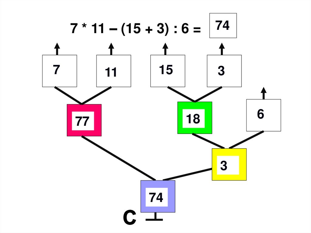 7 * 11 – (15 + 3) : 6 =