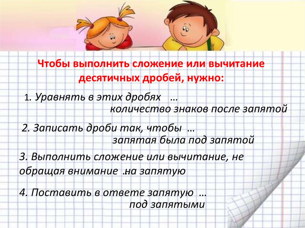 Чтобы выполнить сложение или вычитаниедесятичных дробей, нужно: