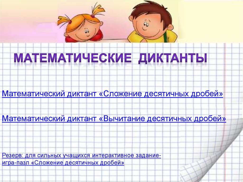Математический диктант «Сложение десятичных дробей»Математический диктант «Вычитание десятичных дробей»