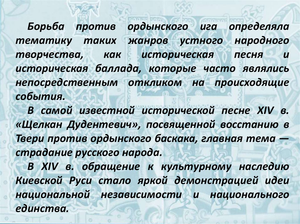Борьба против ордынского ига определялатематику таких жанров устного народного