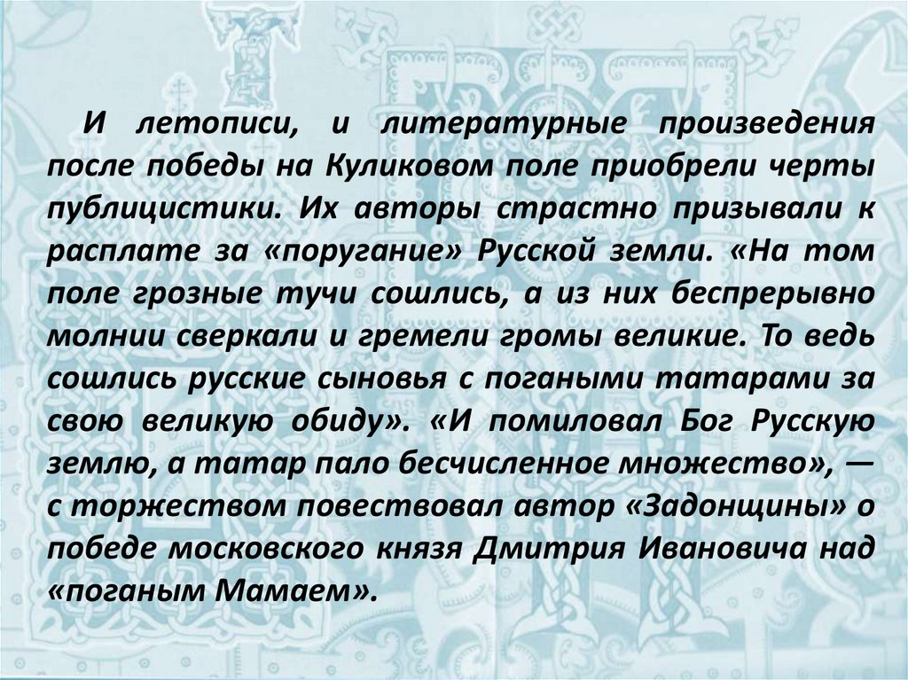 И летописи, и литературные произведенияпосле победы на Куликовом поле приобрели черты