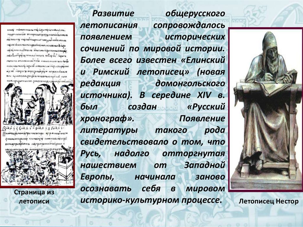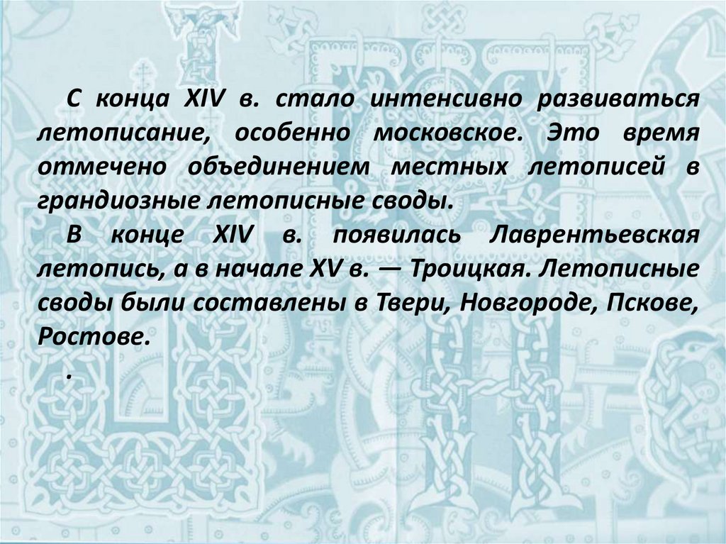 С конца XIV в. стало интенсивно развиватьсялетописание, особенно московское. Это время