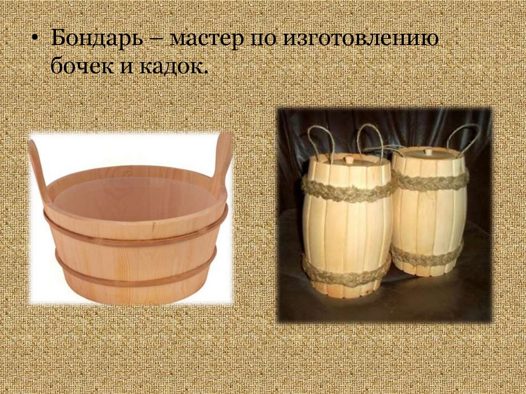 • Бондарь – мастер по изготовлениюбочек и кадок.