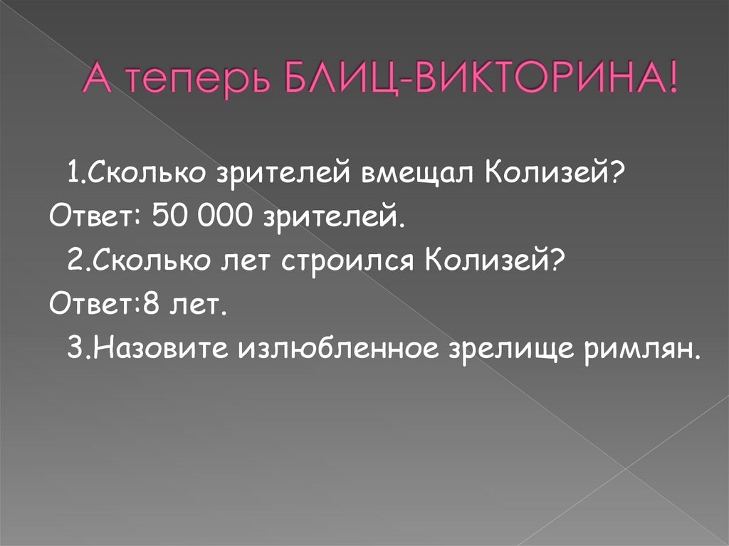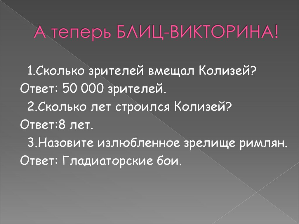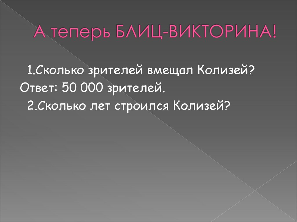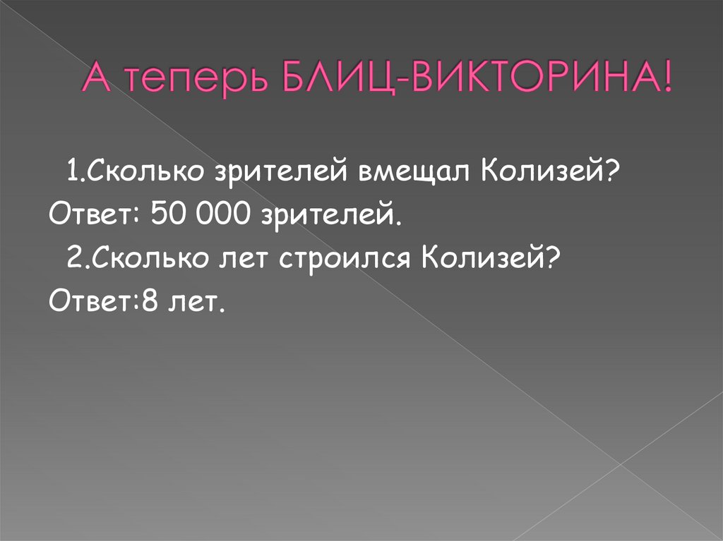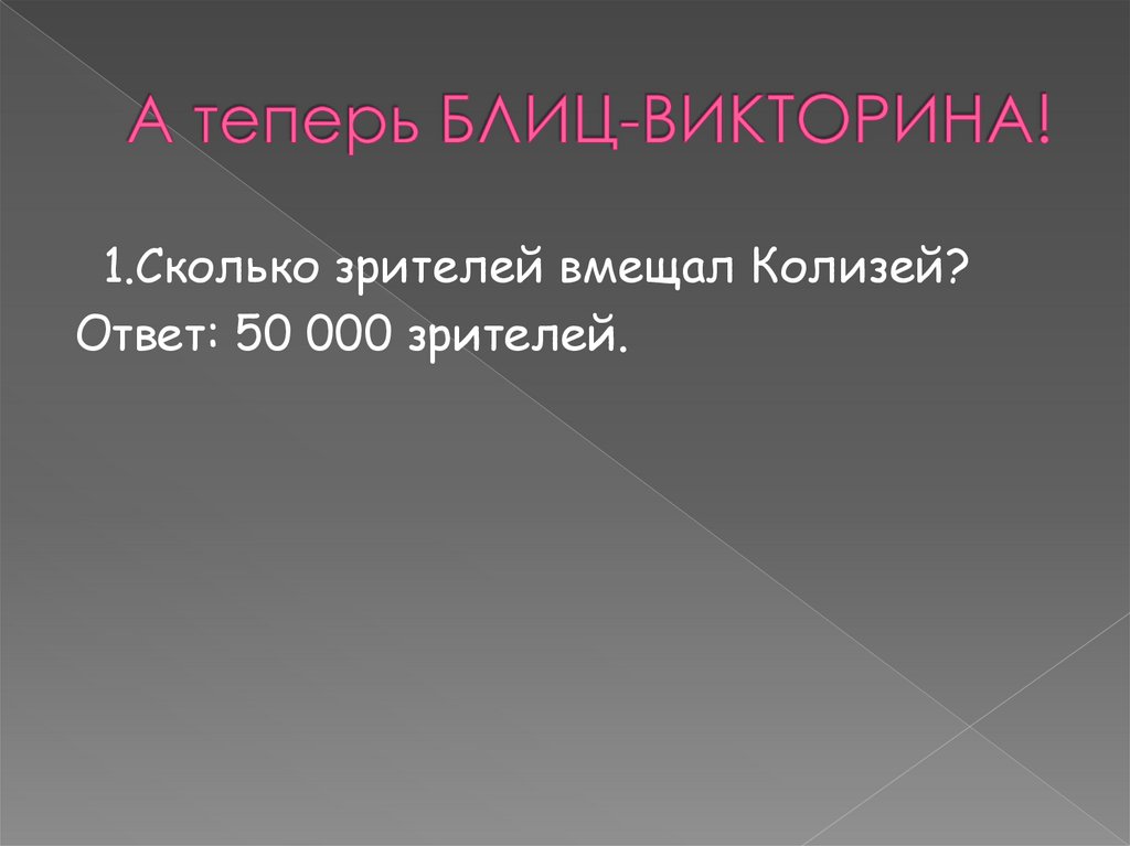 1.Сколько зрителей вмещал Колизей?Ответ: 50 000 зрителей.