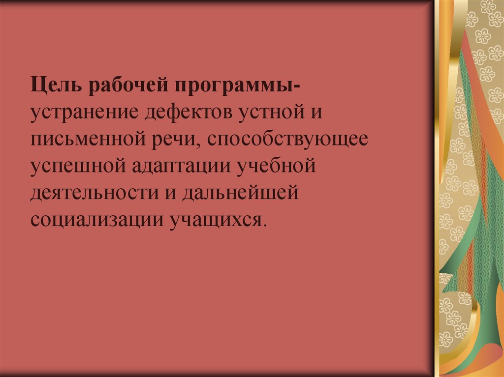Цель рабочей программыустранение дефектов устной иписьменной речи, способствующее