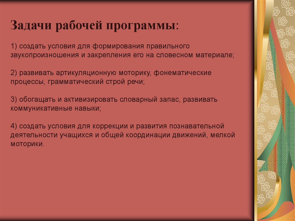 Задачи рабочей программы:1) создать условия для формирования правильного