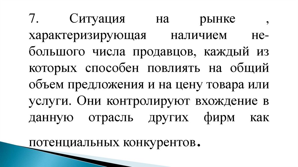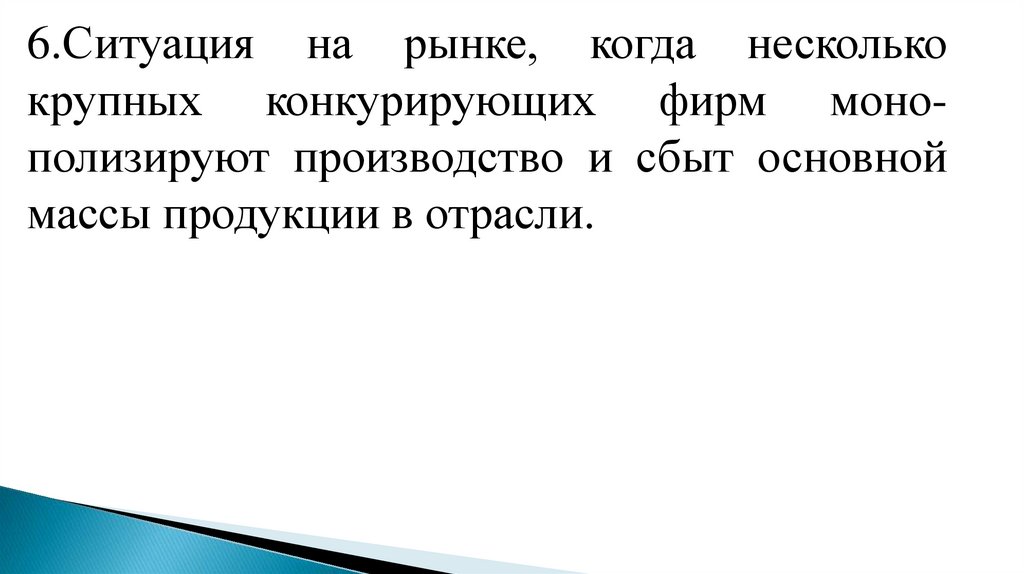 6.Ситуация на рынке, когда несколькокрупных конкурирующих фирм монополизируют производство и сбыт основной