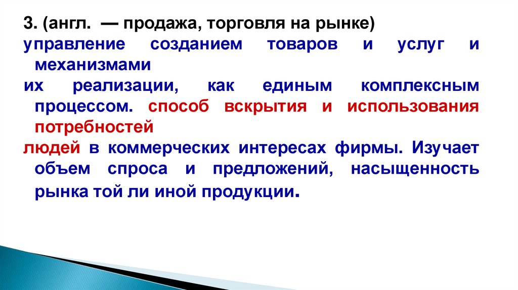 3. (англ. — продажа, торговля на рынке)управление созданием товаров и услуг и