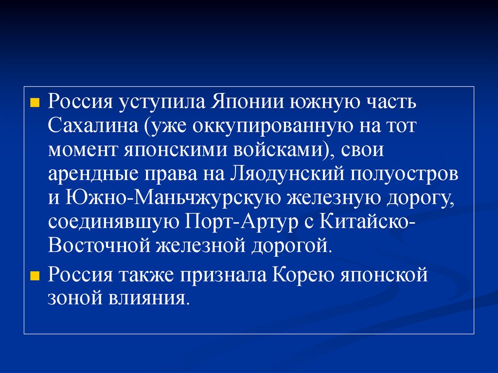 Россия уступила Японии южную частьСахалина (уже оккупированную на тот