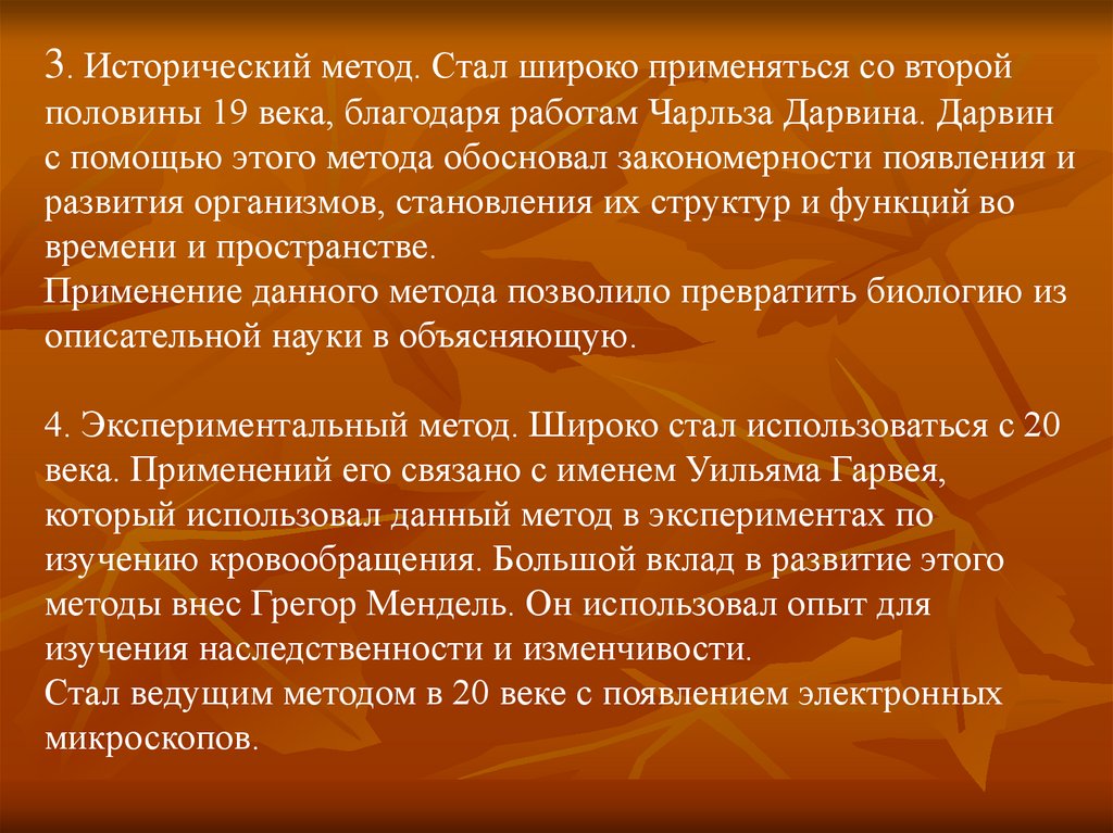 3. Исторический метод. Стал широко применяться со второйполовины 19 века, благодаря работам Чарльза Дарвина. Дарвин