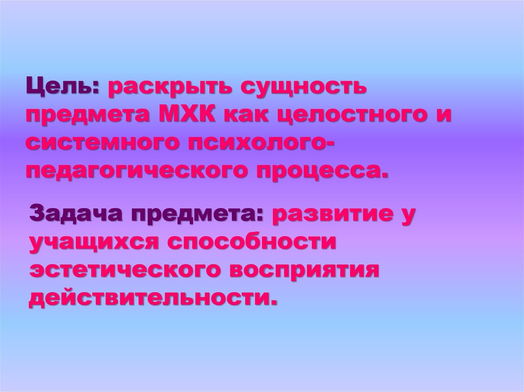 Цель: раскрыть сущностьпредмета МХК как целостного и