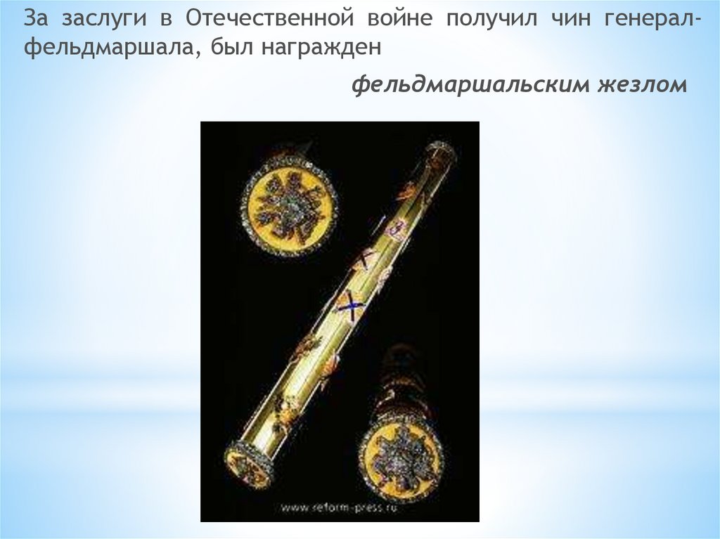 За заслуги в Отечественной войне получил чин генералфельдмаршала, был награжденфельдмаршальским жезлом