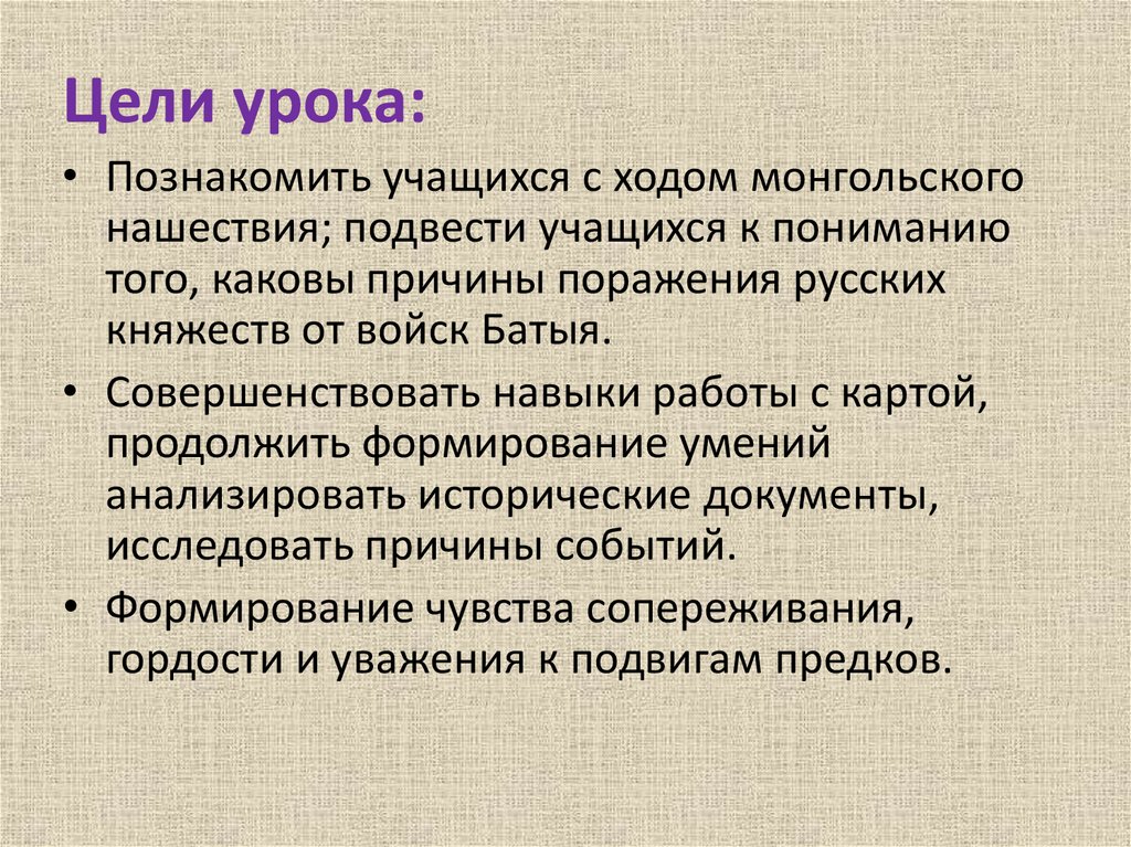 Цели урока:• Познакомить учащихся с ходом монгольского