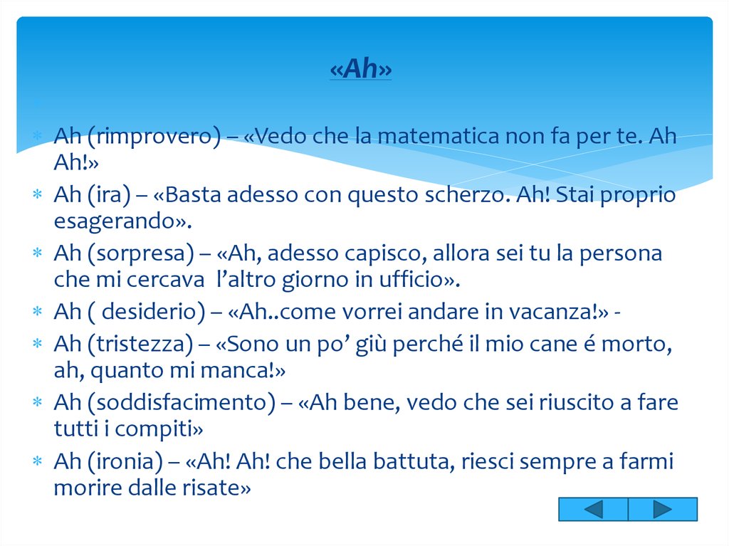 Ah ( desiderio) – «Ah..come vorrei andare in vacanza!» Ah (tristezza) – «Sono un po’ giù perché il mio cane é morto,