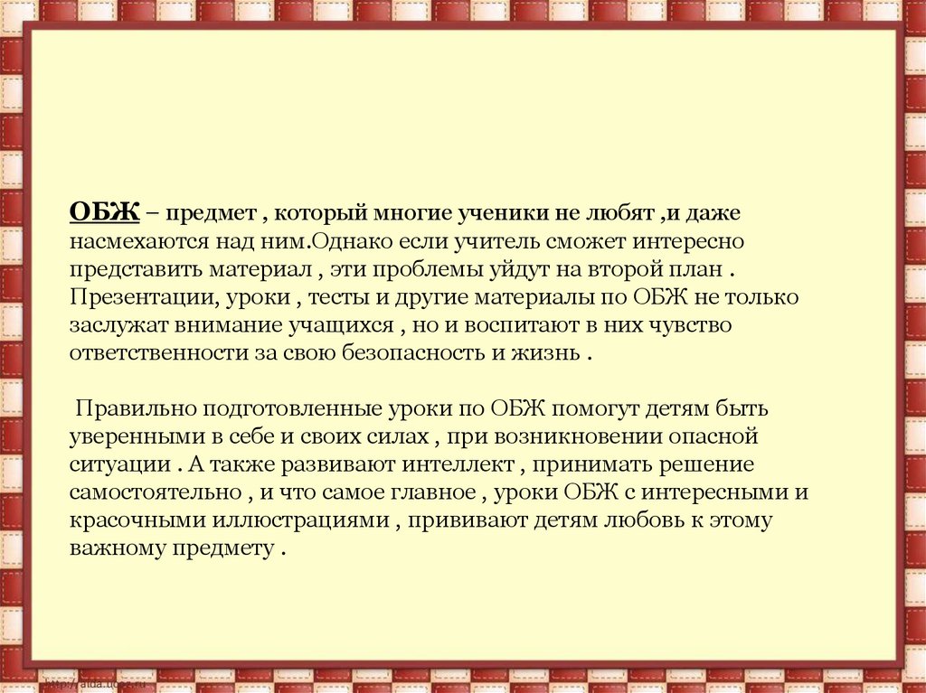 ОБЖ – предмет , который многие ученики не любят ,и даженасмехаются над ним.Однако если учитель сможет интересно