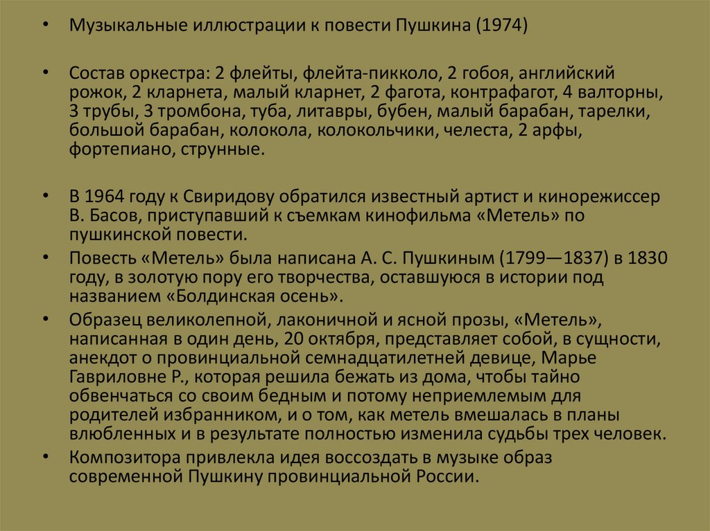 • Музыкальные иллюстрации к повести Пушкина (1974)• Состав оркестра: 2 флейты, флейта-пикколо, 2 гобоя, английский