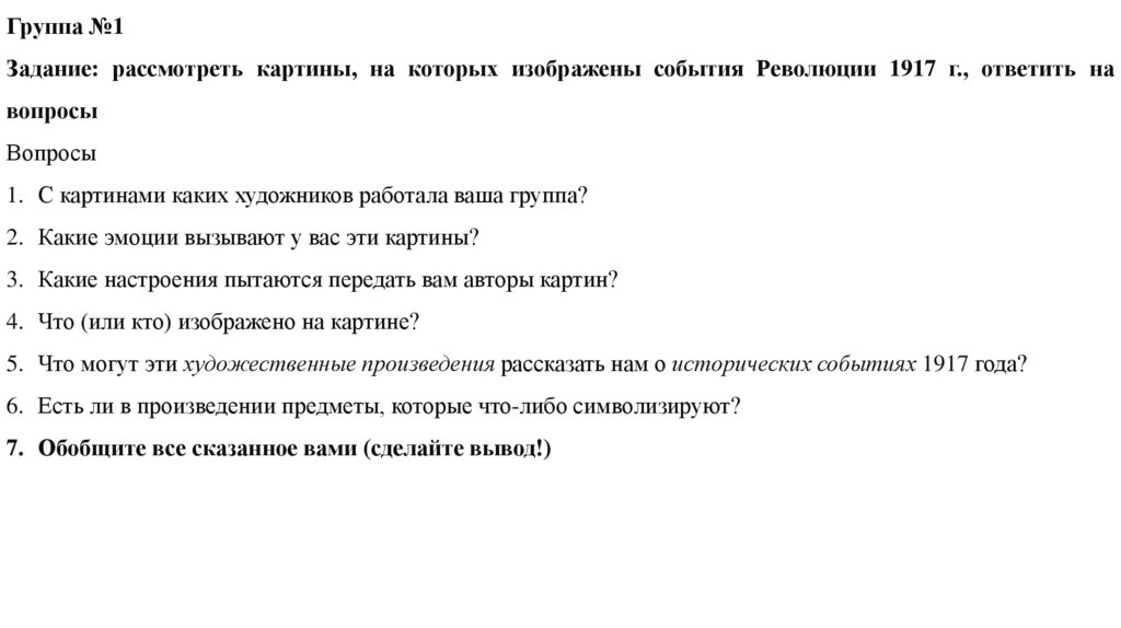 Группа №1Задание: рассмотреть картины, на которых изображены события Революции 1917 г., ответить на
