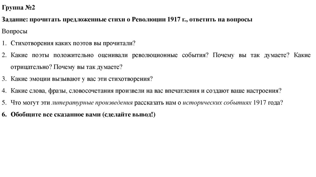Группа №2Задание: прочитать предложенные стихи о Революции 1917 г., ответить на вопросы