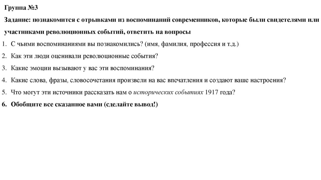 3 группа будет работать с мемуарами* то есть воспоминаниями